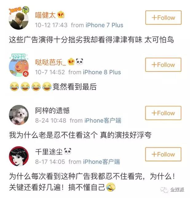 这两种基本的故事模式和四大人物类型排列组合,尬演小剧场自成体系式地按照固定的模版运转,输出成同一个套路的不同版本。万年不变的,则是在 1 分半左右准时插入广告的黄金定律。