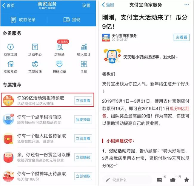 当支付宝有跟商家相关的活动时,比如像这次的“3 月到店付款 19 天,瓜分 9 亿”活动,会在“商家服务”首页及时通知商家,告诉商家可以借助活动提高自己的营业额等等。