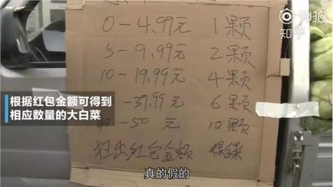 大叔在一卡车白菜上拉了一条横幅,上有五个大字“不要钱白菜”,然后在一块纸板上写了“白菜不要钱,扫码免费送”,让路人先扫红包码领取红包,然后扫付款二维码把领到的红包“花呗付款”付给自己,就可以得到白菜。对于路人来说,白菜确实是“免费”领的。