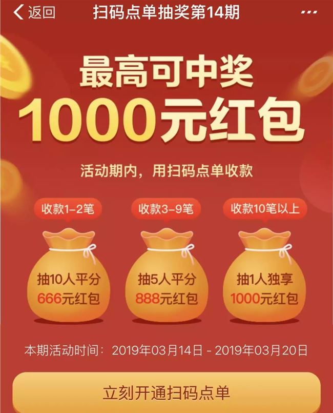 商家开通扫描点单报名后即可参加活动,活动期间收款笔数越多,能参加的抽奖池金额也越大。虽然不是百分百中奖,但是足够吸引一些商家推荐用户使用这个功能了。