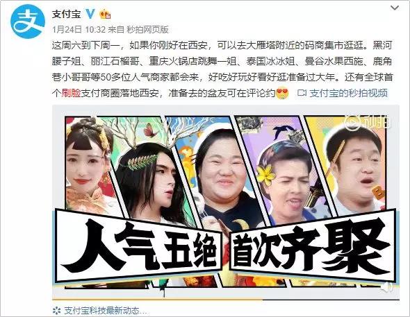 更牛的操作是全球首个刷脸支付商圈落地西安,2019 年 1 月 26 日至 1 月 28 日,支付宝在西安大雁塔西侧小广场举办“码上集市”活动,活动集齐了重庆火锅店一姐、鹿角巷小哥、黑河腰子姐、泰国冰冰姐、丽江石榴哥等网红,阵容很强大了。