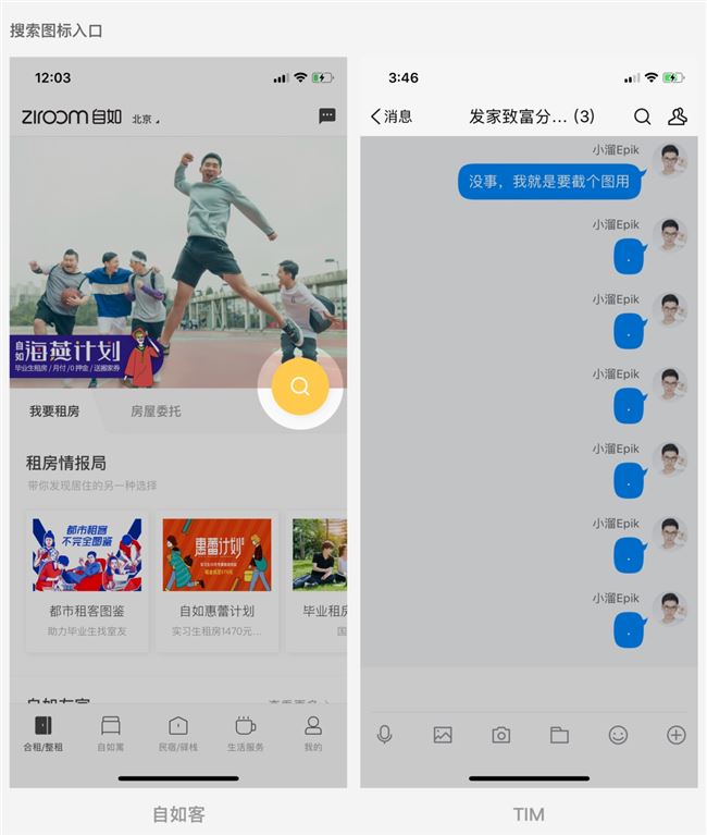 当然也有特别的搜索图标方式,例如:自如客,同样是搜索图标的样式由于不同的位置和层级变化,变得更加突出。(例如:自如客、TIM)