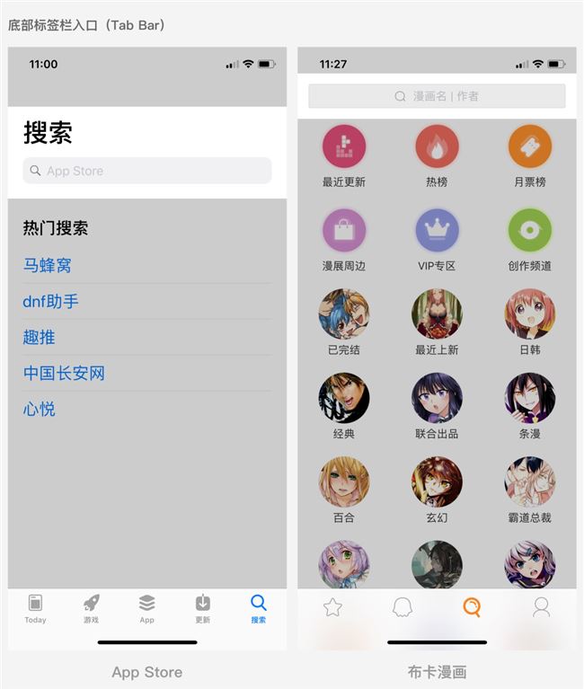 把搜索功能作为底部标签栏中的一个功能模块入口,适合将搜索作为重要流量入口的 App,同时也可以同其他的 Tab Bar入口相结合,如「布卡漫画」就是把搜索和类似发现功能的入口相结合。但是底部标签栏的搜索入口本身并不带搜索功能,所以通常与搜索框样式相结合使用。(例如:App Store、布卡漫画)