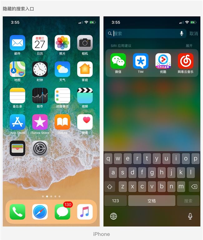 为了让用户更多的使用桌面提供的快速入口,初始界面时将搜索功能隐藏,当进行滑动界面时才会出现搜索功能,例如:iPhone手机解锁后是各个应用入口,当向右滑动时,隐藏的搜索入口就会出现。