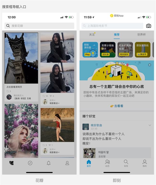 搜索框导航入口除了必须要有的输入框外,还需要一个搜索图标给予用户提示。目前很多应用也会利用搜索框内的区域进行预设文案,可作为提示用户关键词,也可以作为运营的入口来展示。(例如:花瓣、即刻)