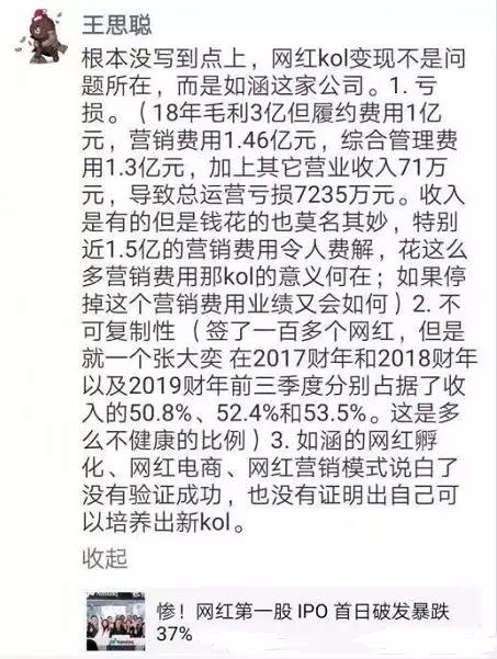 但如涵的“暴跌”,却引起了“国民老公”王思聪的注意,他在朋友圈对如涵提出了 3 项质疑。