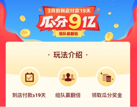 从2019年3月1日至31日期间,用户使用支付宝累计到店付款≥19天,并且单笔订单付款金额≥2元,即可以在同年4月1日一起瓜分9亿元。