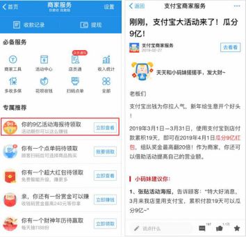 “3 月到店付款 19 天,瓜分 9 亿”活动,会在“商家服务”首页及时通知商家,并告诉商家可以借助活动提高自己的营业额等等。