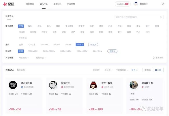 在星图上注册一个广告主账号。创建星图账号是免费的,不用关注、不用加群、不用转发朋友圈、更不需要把七大姑八大姨拉来裂变。兄弟听我一言,注册星图不只不花钱,还可以赚钱。通过对公账户款验证后(赚到钱的话可以给我留个言),就可以看到星图上的达人数据(达人广场)。