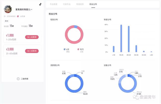 接下来,根据产品的特征及目标顾客群特征,筛选合适的 KOL。星图上每个达人的都有详细的官方分析数据,通过擅长风格、报价、粉丝量筛选后,可以查看每个达人的粉丝,看好数据,决定要不要把 TA 加入购物车。