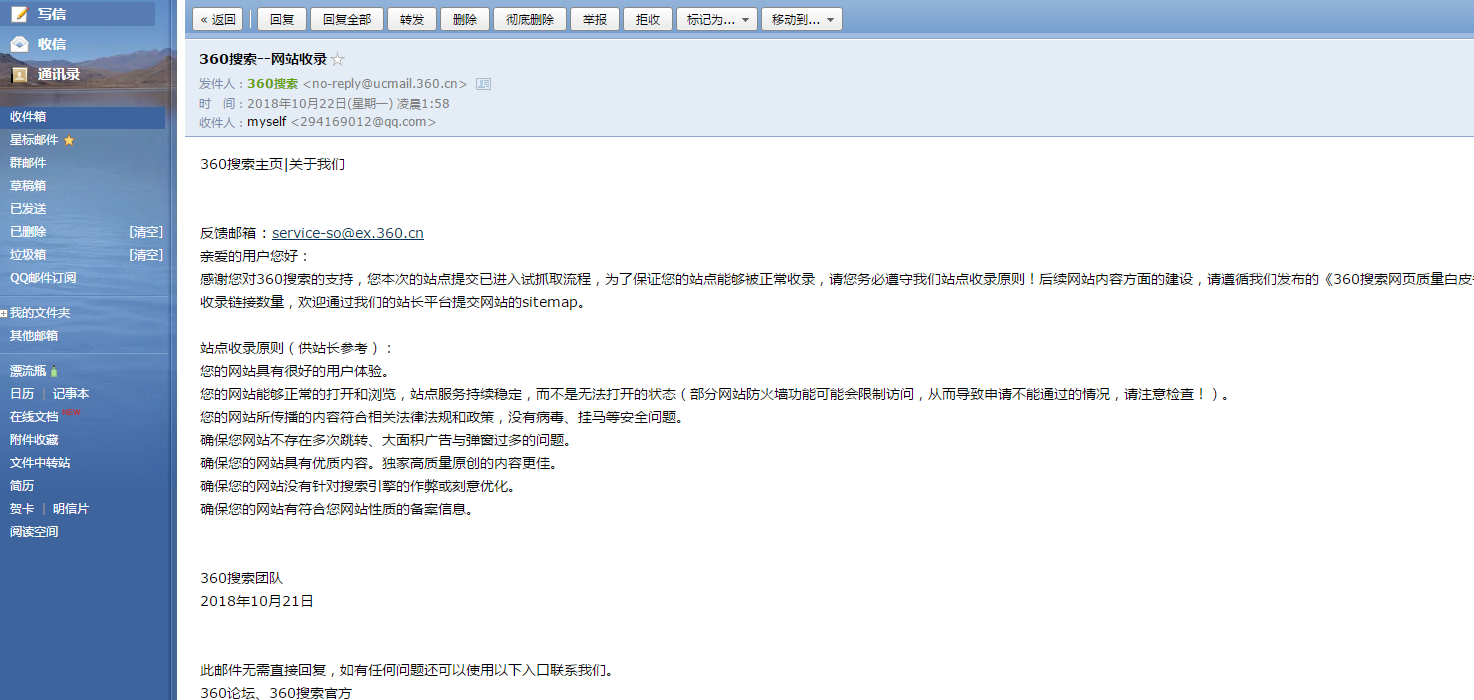360论坛反馈完之后,管理员会在上班时间通知你,网站在收录之中,我的站已经开始在收录了,不用一周左右的时间就可以查询得到。 以下是360官方邮件通知信息