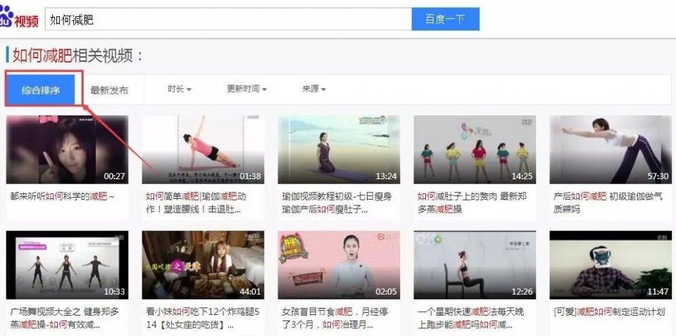 我们以百度搜索为例:比如你要做“如何减肥”这个关键词,在百度里按照综合排序的方式搜索视频的结果如下所示:
