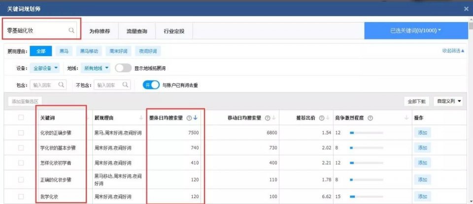 比如你做化妆品的可以去挖掘一些:“零基础化妆视频教程、免费学化妆视频教程”等等这样的相关关键词,一般情况下利用这样的关键词做好视频的时候,不需要再去做过多的操作,即可获得良好的排名。可以借助百度关键词规划工具去挖掘关键词!如下图: