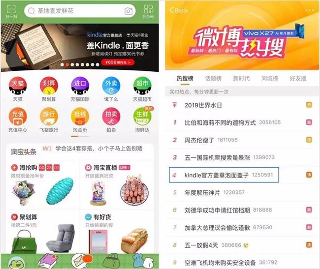 比如,最近 Kindle 官方盖章了泡面盖子,登上了微博热搜榜。除此之外,Kindle 还联合聚划算推出了泡面礼盒,开售 2 分钟就卖出 100 台,相关话题阅读数已达千万。