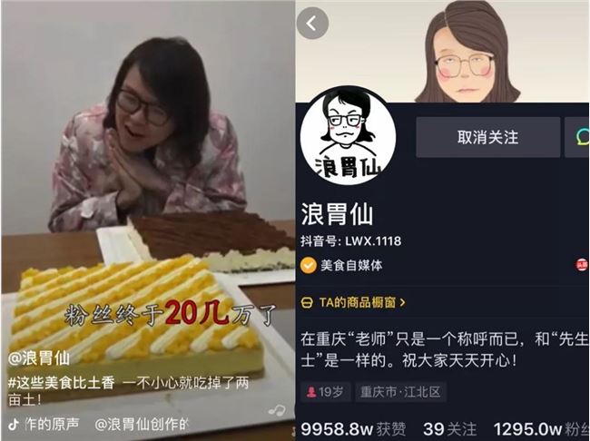 2018 年年底,进驻抖音时间不长的“浪胃仙”发布了一条视频,庆祝自己粉丝量突破了20w。