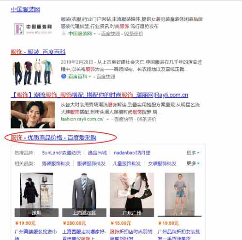 首先我在百度搜索引擎搜索框内输入“服饰”二字,然后按照日常惯例一个回车进行搜索结果,结果中显示排名第一和第二的分别是竞价位淘宝跟京东商城,请看下图