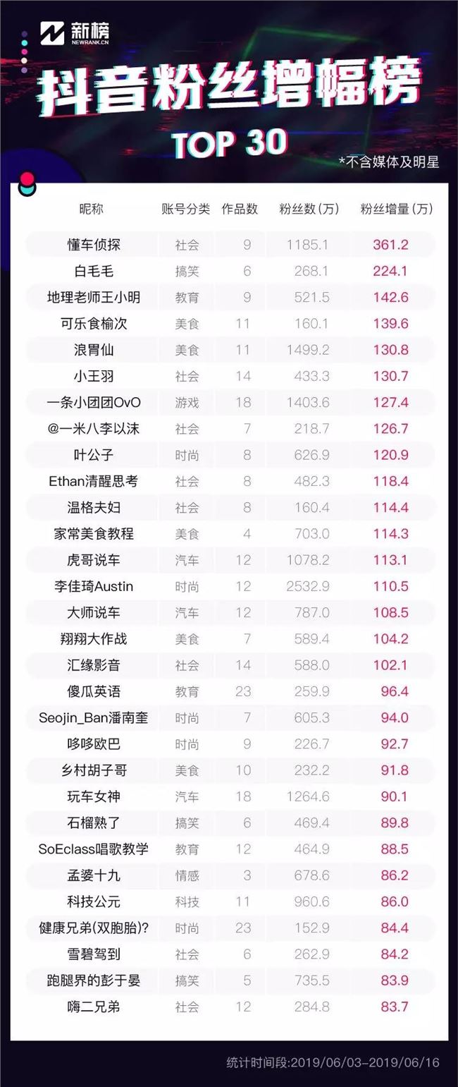 依托新榜采集到的海量抖音数据,我们同时推出第 9 期“抖音达人粉丝增幅榜TOP30”(完整榜单见文末),呈现两周内粉丝增长最多的抖音达人(不含媒体及明星)。本次统计周期为 6 月 3 日~ 6 月 16 日。
