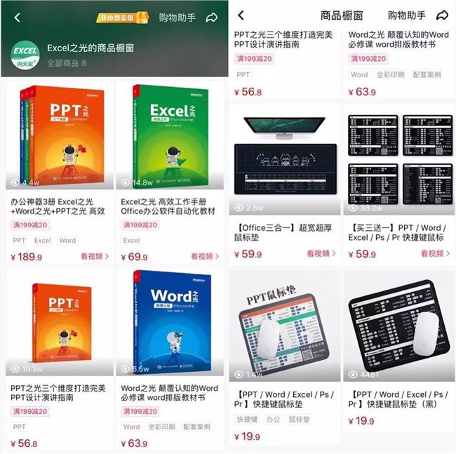 有些可以直接在抖音购物车内进行购买,以「Excel之光」的商品橱窗为例,同名书籍的售价在69. 9 元,商品浏览量为14. 8 万,实际售卖 1970 本,收入约为 14 万。