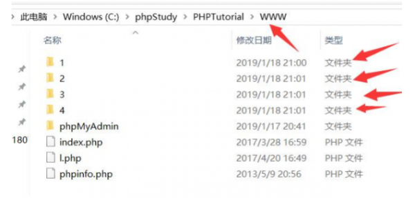 4、在这个打开的WWW根目录里,创建四个文件夹,这个学名叫子目录,名字随便取,别用汉字,数字拼音都行,这四个文件夹用来存放你的四个网站,自己能记住就行了。为了方便英语差的同学理解,我用1234,要不然我肯定用他们程序的名字:dedecms、Zbloqphp、wordpress、discuz。