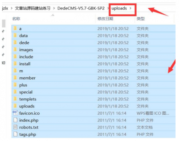5、我们今天先学习用dedecms建站,打开解压完的dedecms文件夹,打开uploads文件夹,全选复制里面的文件;