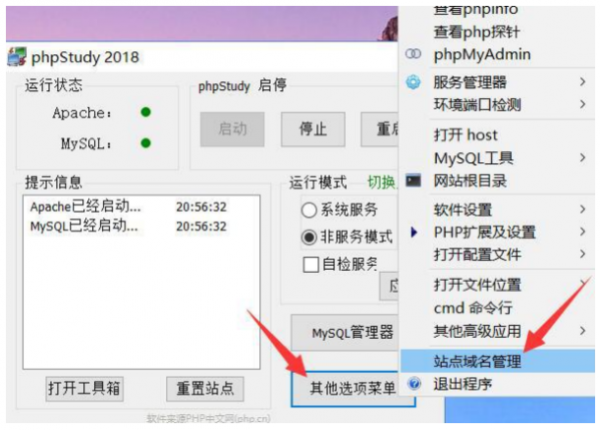 3、点其他选项,点网站根目录,先看看你那两个钮是不是绿色的,不是的话记得点下启动。