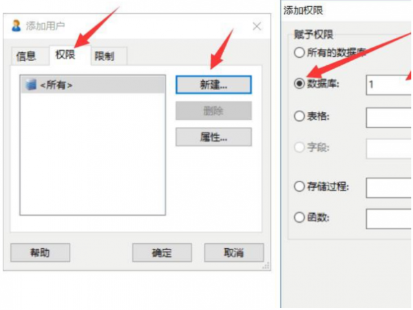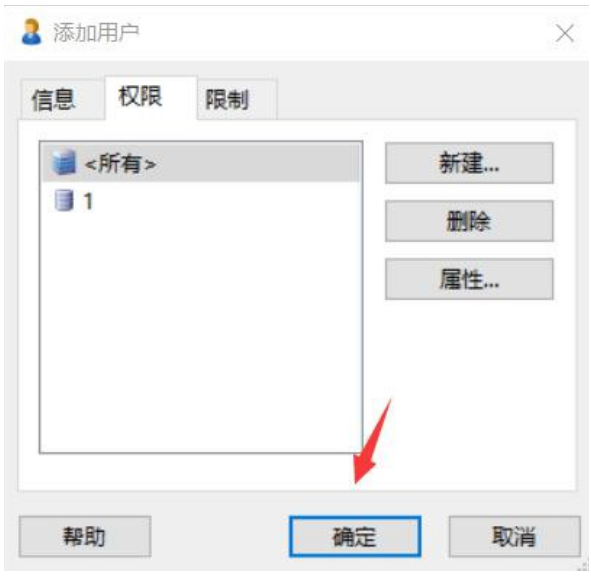 16、点上面的权限,点新建,找到你的数据库1,然后把空的全部打勾,然后再点确定;