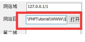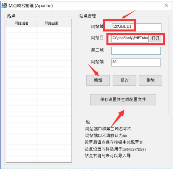 8、这个地方直接修改它默认的那些资料,域名是127.0.0.1/1,下面的路径,一定要精确到你的子目录,就是那个文件夹1,弄好这两项,点新增,然后再点保存,生成配置文件。这时候phpstudy会自动重启。域名是什么?这个就相当于baidu.com ,taobao.com,只是我们是本地练习,国家规定运营商不能给个人开放80端口,我们不能弄个域名解析到自己电脑上,只能用个本地域名代替。在服务器上我们就能绑定正儿八经的域名了。