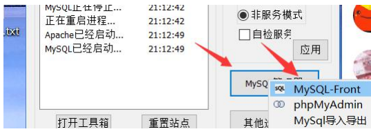 10、下面我们就去dedecms创建一个mysql数据库,点mysql管理器,点第一个mysql-front,打开;