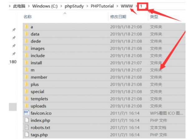 6、然后打开你的根目录里,子目录为1的文件夹,把你复制的内容粘贴进去,粘贴完是这样的。根据以往经历,有些头脑发热的学员会把uploads文件不展开,直接复制粘贴进来。