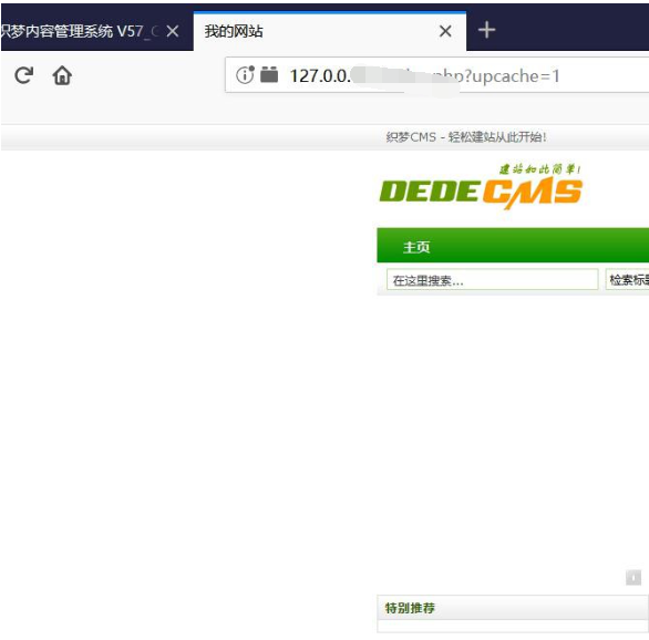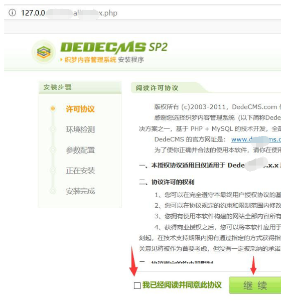 18、好了,数据库搞定了,我们就要去建站了。在浏览器输入:127.0.0.1/1,会自动跳转Dedecms安装界面,