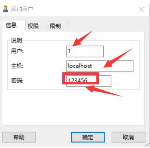 15、用户名,建议和数据库一样,还是1吧,好记,主机填localhost,密码随意,先不要着急点确定;