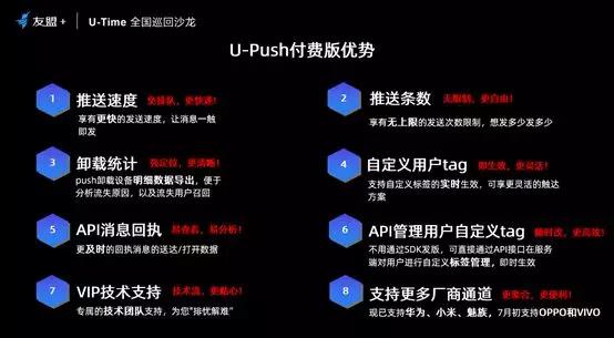 每次和开发者聊的时候,问友盟+也在做Push?像在新手、成长、流失阶段我们都有Push,今年推出Push付费版,和免费版相比推送速度有非常大的提升、推送条数不限制,还有我们提供卸载统计,可以将卸载的人存为一个人群,可以更系统地进行数据分析。自定义用户Tag,我们做标签Push时,免费版是T+1,就是今天打标签明天才能用,但付费版是今天打了今天用。