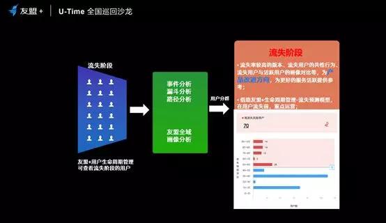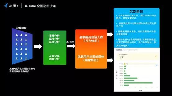 友盟+用户生命周期管理有一个沉默预测,有三个方式是如何唤醒沉默用户,还有在用户沉默之前防止其沉默,我们有预测模型“高沉默风险的用户”,你可以提前运营,有效地避免沉默。