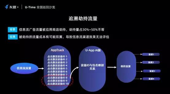 基于这种背景,我们推出了流量劫持解决方案。在投放信息流广告时,U-App AI版和Apptrack两个产品,可以监测到用户从点击到激活的整个链路。在这个链路中,我们可以知道哪些流量被劫持,以及被劫持到哪个渠道。追溯分析出被劫持多少量后,我们要把这部分被劫持的量归属到信息流渠道,准确的评估信息流的拉新成本与效果。