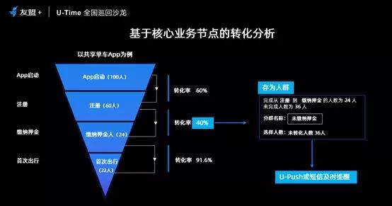 以共享单车为例,有启动、注册、缴纳押金、首次出行,最重要的环节是注册到缴纳押金,可能会发现有 60 人注册,有 24 人缴纳押金,其中有 34 人流失了。这时候要圈出这部分人群并及时Push,引导其进入下一步。