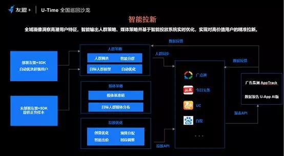 智能拉新的过程:U-App AI版会识别高粘性的活跃用户,在全网找到相似人群,同步到核心媒体的核心渠道,像广点通、今日头条、UC、百度,我们通过App监测曝光、点击情况再反哺到人群,不断降低拉新成本。可能有的开发者还没用U-AppAI版,我们支持提供人群的正负样本,通过算法输出符合App需求的人群包。