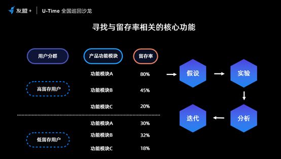 寻找与留存相关的核心功能,第一个群是高留存用户,第二个是低留存用户。我们分析高留存用户使用功能模块的情况,功能A留存率高达80%,猜测功能A可能是影响留存的核心因素之一。通过实验找两个小渠道,找相应的版本做测验,发现功能A是我们影响因素之一,那么整个版本做相应的迭代。