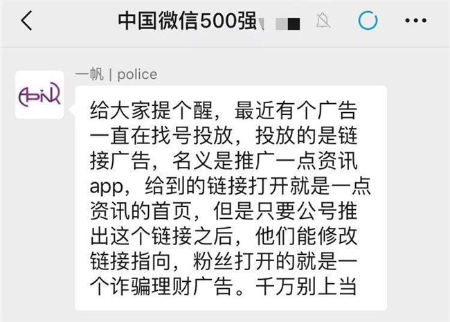 “最近有个广告一直在找号投放,投放的是链接广告,名义是推广一点资讯App,给到的链接打开就是一点资讯的首页,但是只要公号推出这个链接之后,他们能修改链接指向,粉丝打开的就是一个诈骗理财广告……”