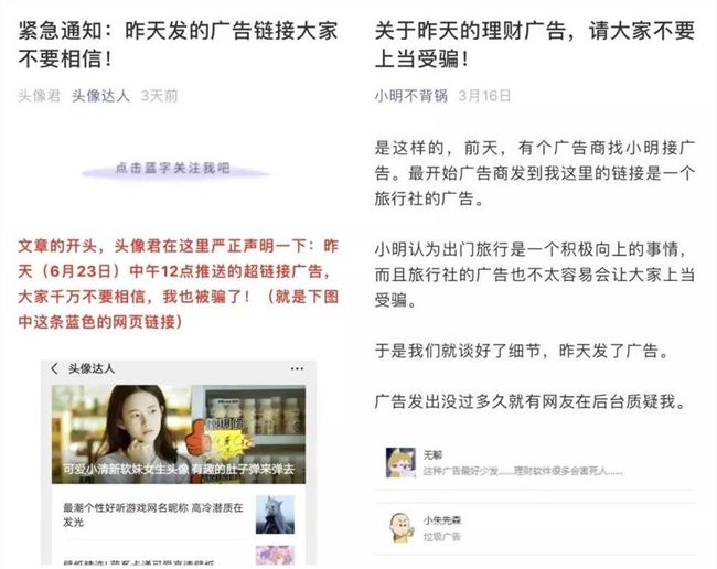 意识到被骗后,第二天,“头像达人”的运营者立即推文《紧急通知:昨天发的广告链接大家不要相信!》和粉丝解释,昨天的推送链接被修改了,不确定是否存在欺诈和风险。