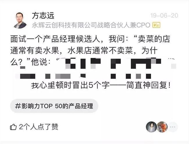 提问者的公司是永辉云创,我猜想和永辉超市大概有关系,百度了下,永辉云创是永辉超市生的孩子。招的是产品经理,那大概面试者希望这个产品经理对零售业这个行业有比较深刻的洞察。