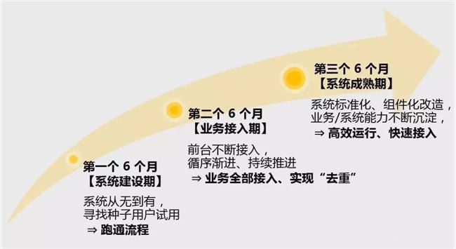 在这个过程用 6 个月,如果有坚定的信念和较强的目标感,基本能完成单条产品线全面接入的目标。 6 个月的业务接入期,加上 6 个月的系统早期建设, 1 年节点又是一个关键的里程碑。并且全部业务接入,也是一个比较好量化的体现中台去重、复用的系统指标。