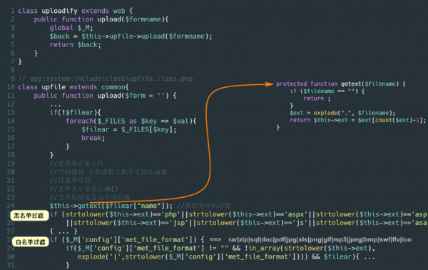我们从上面的代码中可以看出上传文件有一些模式,还有变量的信息,info这个变量是可以控制的,我们看下upfile跟upload调用的方法是什么作用,追踪分析代码发现这个是用来存储上传文件的路径信息的,这2个变量值会直接将上传的路径给改变,这也是该漏洞产生的原因,我们接着继续分析代码的漏洞,Metinfo在使用doupfile上传的时候回对上传的文件名进行安全过滤,基本的一些脚本文件都已经过滤掉了,只能上传一些图片格式的文件,使用白名单安全机制对上传进行了严格的安全限制。