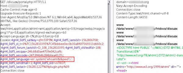discuz漏洞影响范围:discuz x3.4 discuz x3.3 discuz x3.2,版本都受该网站漏洞的影响,漏洞产生的原因是在source目录下function文件夹里function_core.php代码里的cookies与语言language参数值并没有详细的进行安全过滤与检测,导致可以插入恶意的代码到数据库,并远程执行恶意代码,可获取webshell权限。