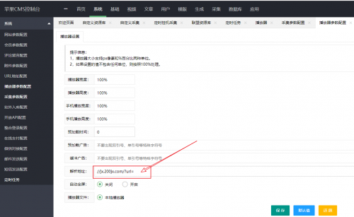 7、重点!!!安装播放器,这个一定不能省,不然就算你采集了资源也播放不出来。视频-播放器,将采集的资源和相对应的播放器是否启用即可,将各大视频站点的状态和解析状态设置为启用。然后可设置单独的解析地址,或者设置全局地址。系统-播放器参数设置,解析地址设置成解析提供商的解析地址。