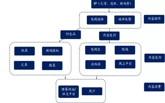 IP经济已经形成了一套完整的产业链运作模式:上游IP来源,下游IP变现,前者主要还是文学、漫画和游戏等为主。而后者可以分为衍生品发行和内容发行,最终形成内容消费。