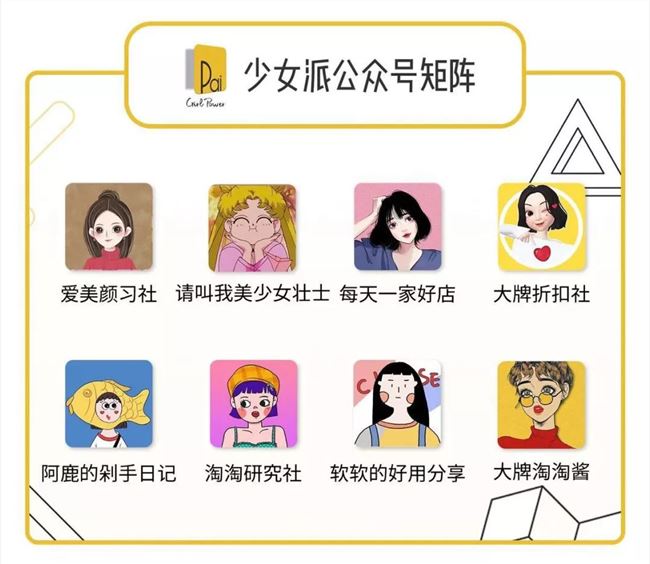 目前,少女派科技的微信矩阵共有 12 个微信公众号矩阵,有 3 到 4 个账号正在孵化当中,针对不同时间不同年龄层次的用户需求,旗下账号差异化明显: