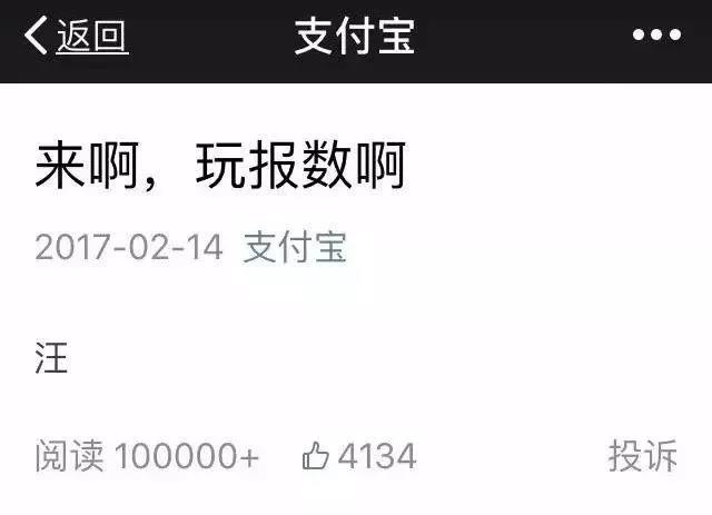 作为一个企业公众号,支付宝每条推送下面几乎都是满屏的评论。就在 2017 年 2 月 14 日情人节当天,支付宝靠一个“汪”字,就引起了评论区一场“单身狗联盟”的狂欢,这篇推送轻轻松松就收获了一篇十万加,还在各大社交媒体高调地刷了屏。