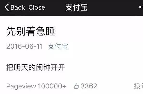 也正是这种接地气的运营方式,一改大厂以往的一本正经的刻板印象,反而给粉丝留下了一个亲切且任性的小编形象,因此支付宝的公众号并没有给人一种在和企业沟通的感觉,而是和小编沟通的氛围,这无疑拉近了用户和企业的距离。