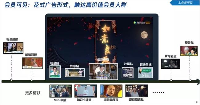 针对会员人群,也推出了相应的品牌曝光策略,比如,推出花式广告形式,用明星播报、明星贴,如意帖,或者是创意中插、片尾彩蛋等形式来触达高价值的会员人群。