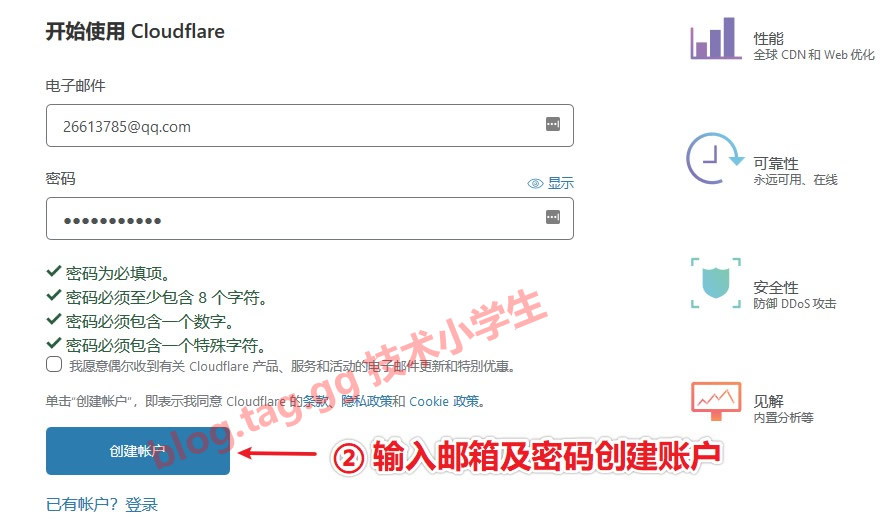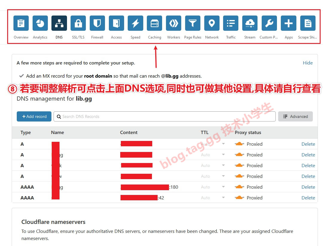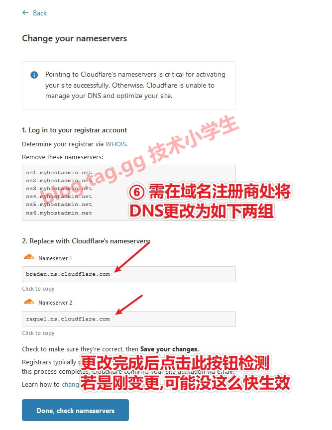 注意:Cloudflare默认只支持DNS方式接入,也就是说,要用他们的cdn,dns必须更改为他们的,具体dns地址在开通后页面会有显示。